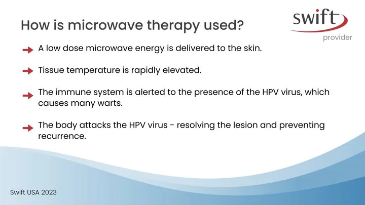 Swift® therapy works by delivering targeted microwave energy directly to the wart tissue. Rather than freezing or cutting the skin, Swift stimulates your body’s immune response to recognize and eliminate the virus naturally. Treatments are quick, performed in-office, and require no open wounds or downtime. Most patients appreciate that Swift allows them to return to normal activities immediately after treatment.
